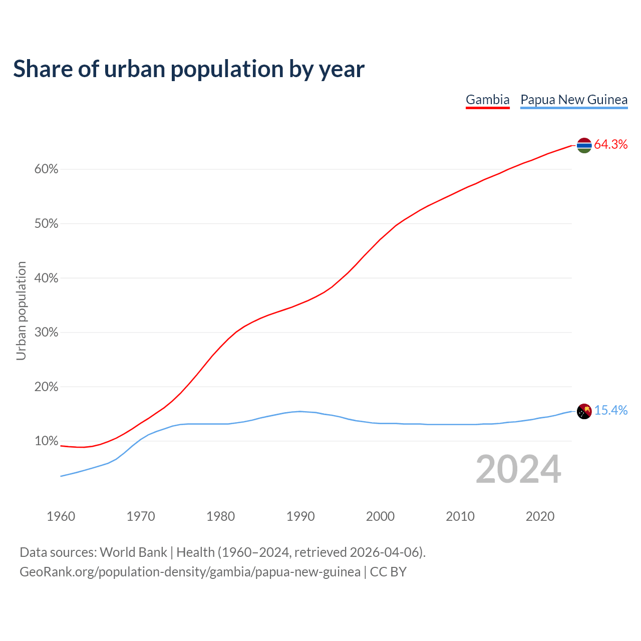 From 2004 to 2024, the share of urban population changed from 51.5% to 64.3% in the Gambia and from 13.1% to 15.4% in Papua New Guinea.