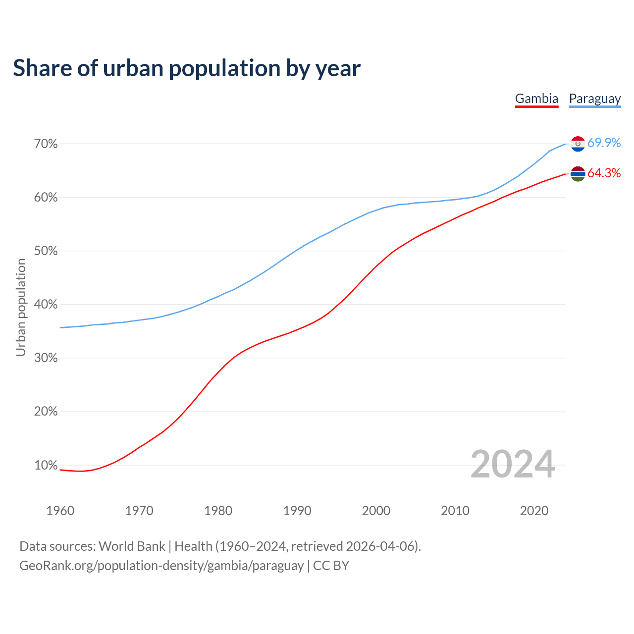 From 2004 to 2024, the share of urban population changed from 51.5% to 64.3% in the Gambia and from 58.7% to 69.9% in Paraguay.