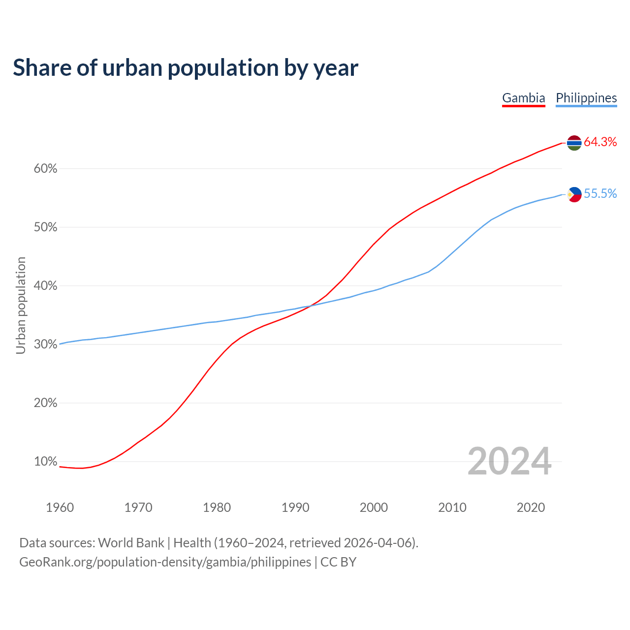 From 2004 to 2024, the share of urban population changed from 51.5% to 64.3% in the Gambia and from 40.9% to 55.5% in the Philippines.