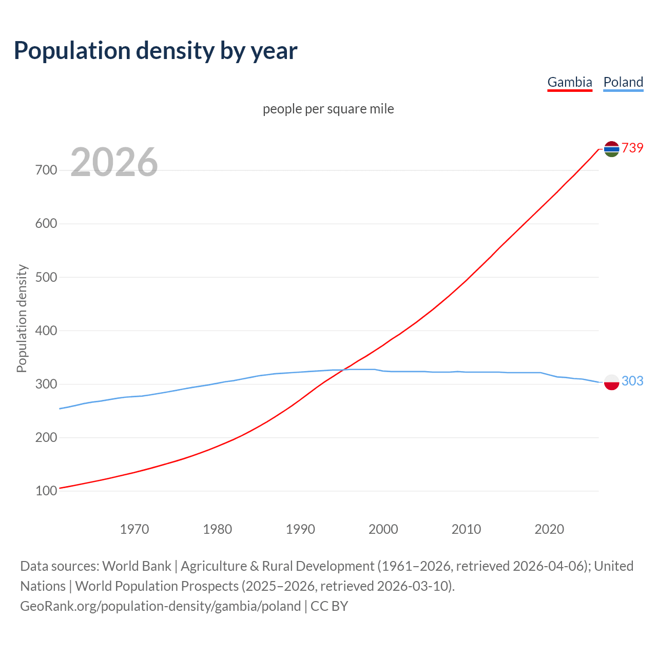 From 2006 to 2026, population density in the Gambia increased by 68.2%, compared to a 6.1% decline in Poland.