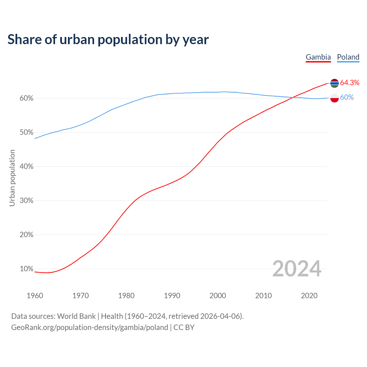 From 2004 to 2024, the share of urban population changed from 51.5% to 64.3% in the Gambia and from 61.7% to 60% in Poland.