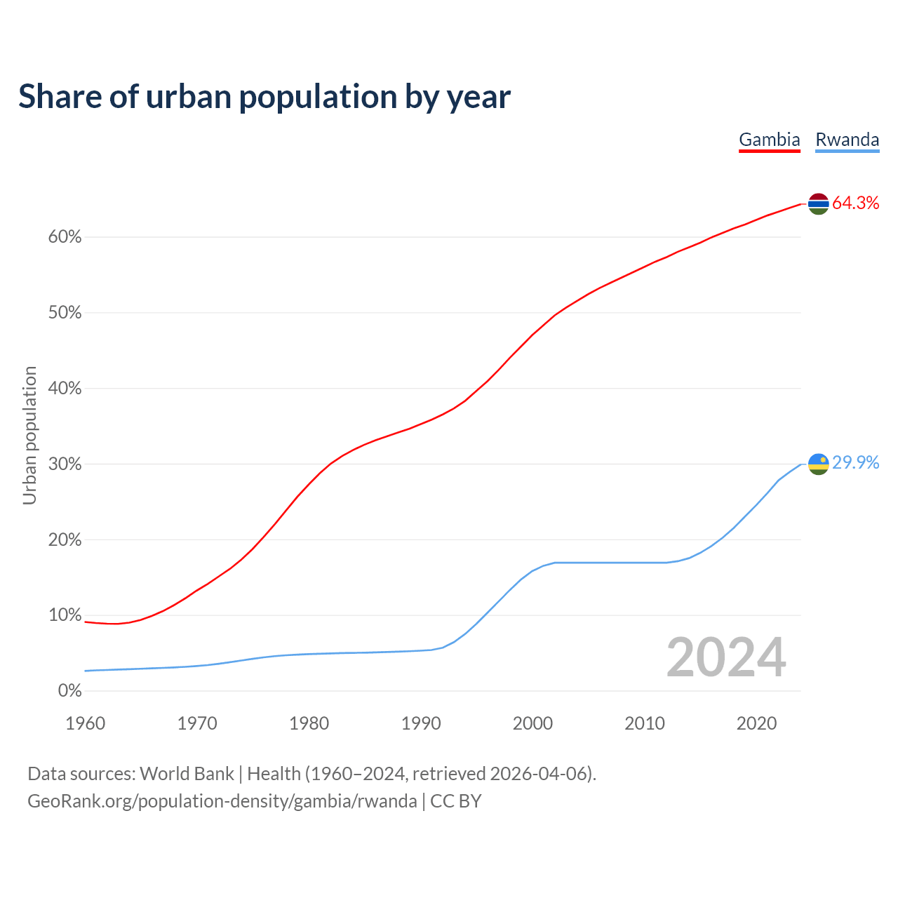 From 2004 to 2024, the share of urban population changed from 51.5% to 64.3% in the Gambia and from 16.9% to 29.9% in Rwanda.