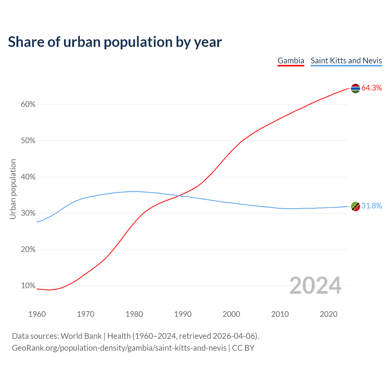 From 2004 to 2024, the share of urban population changed from 51.5% to 64.3% in the Gambia and from 32.1% to 31.8% in Saint Kitts and Nevis.