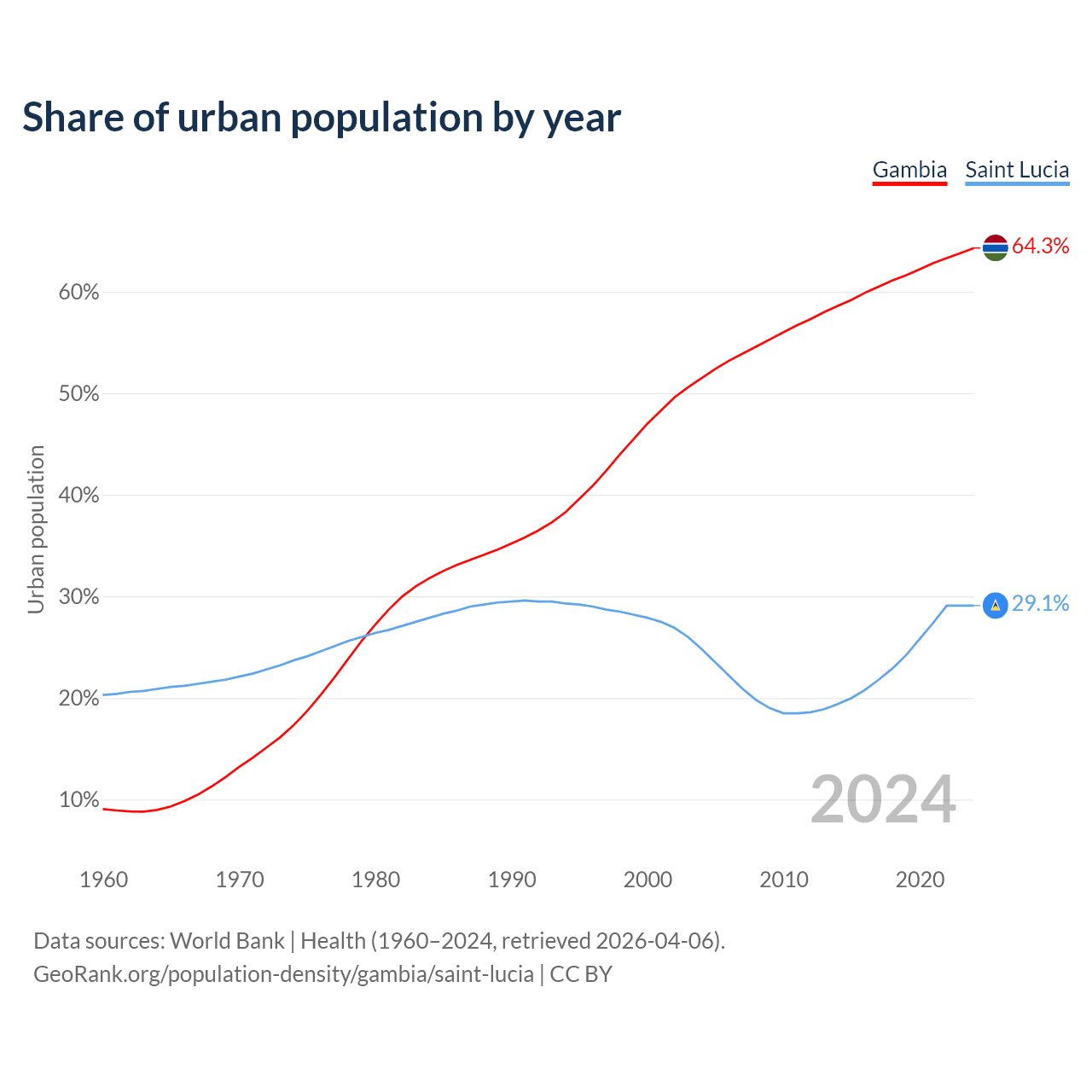 From 2004 to 2024, the share of urban population changed from 51.5% to 64.3% in the Gambia and from 24.8% to 29.1% in Saint Lucia.