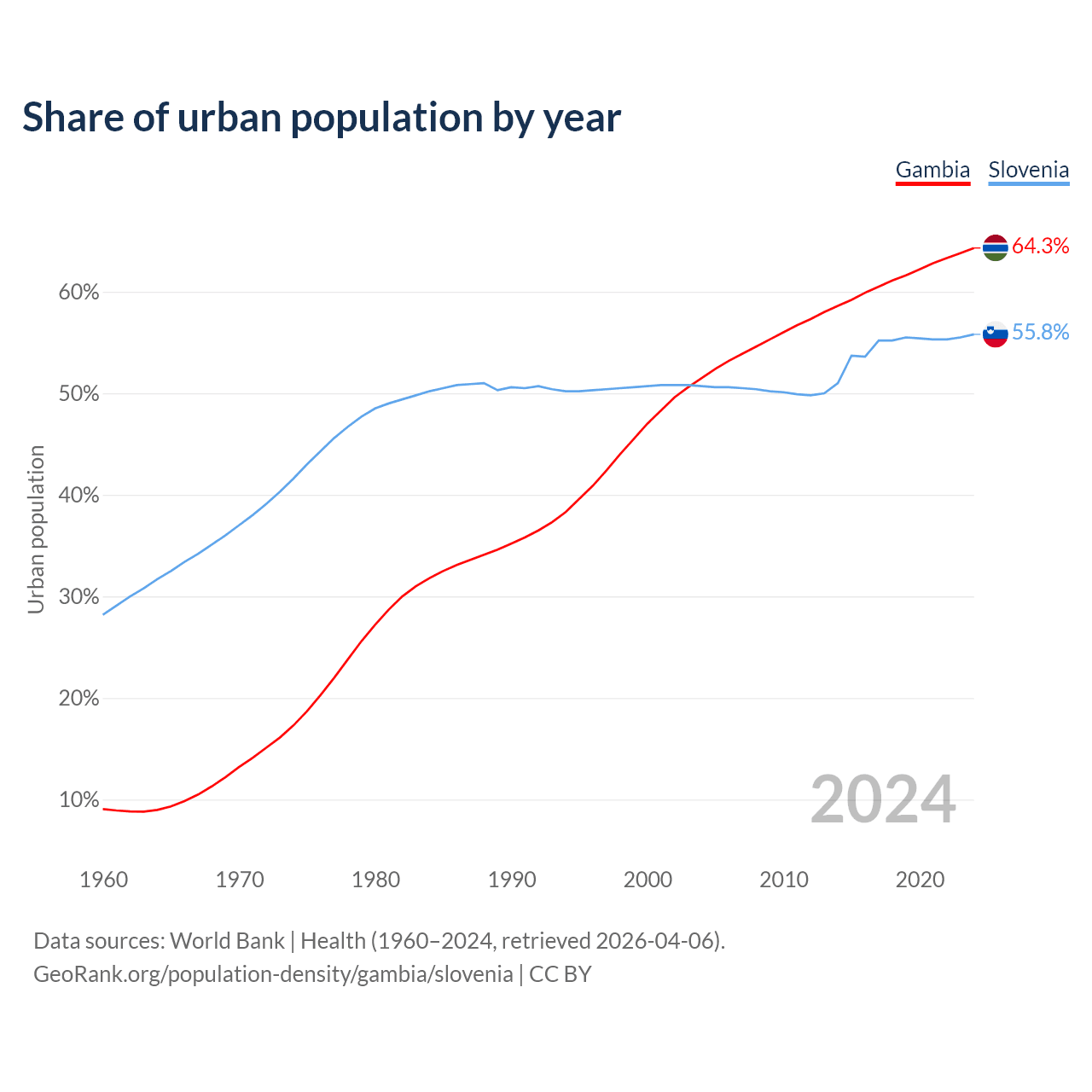 From 2004 to 2024, the share of urban population changed from 51.5% to 64.3% in the Gambia and from 50.7% to 55.8% in Slovenia.