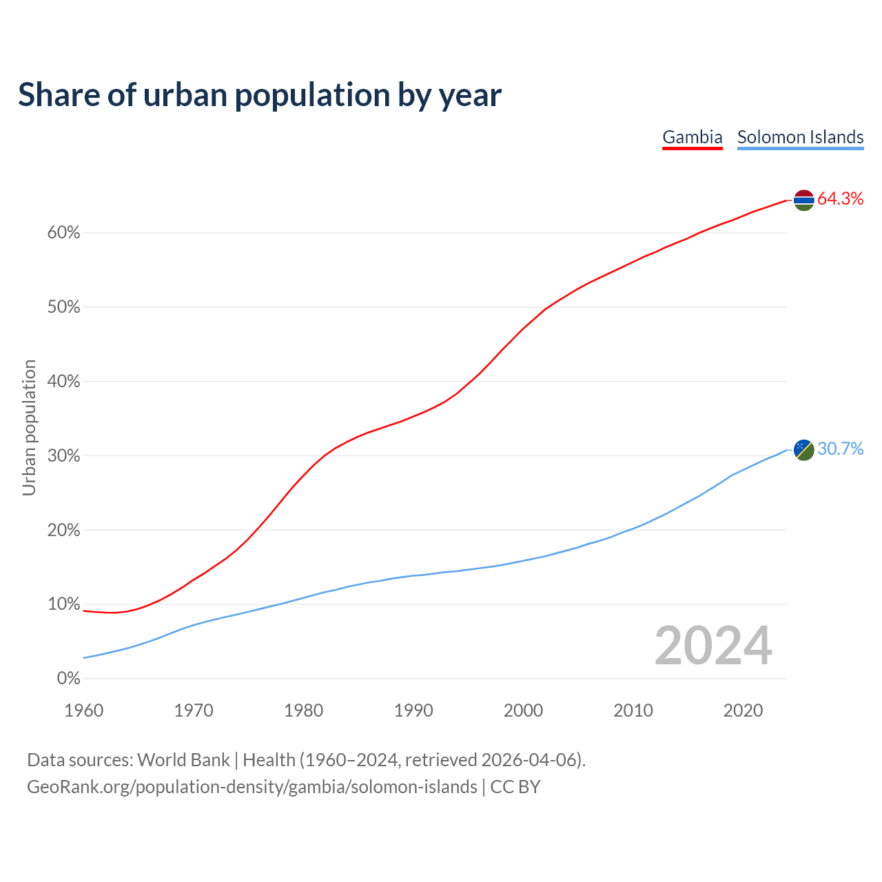 From 2004 to 2024, the share of urban population changed from 51.5% to 64.3% in the Gambia and from 17.2% to 30.7% in the Solomon Islands.