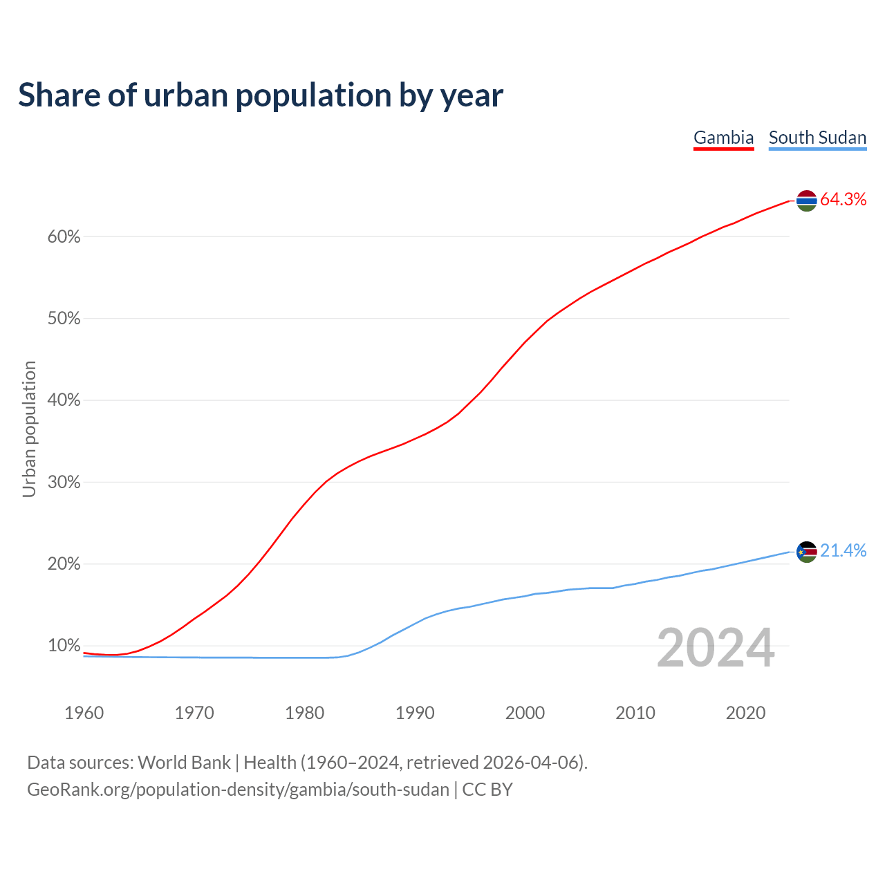 From 2004 to 2024, the share of urban population changed from 51.5% to 64.3% in the Gambia and from 16.8% to 21.4% in South Sudan.