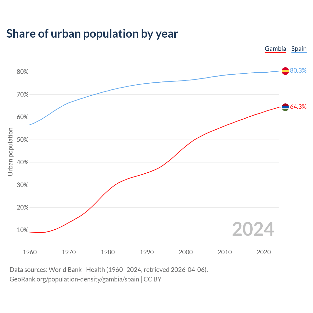 From 2004 to 2024, the share of urban population changed from 51.5% to 64.3% in the Gambia and from 77% to 80.3% in Spain.