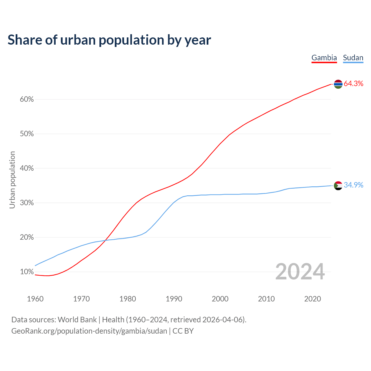 From 2004 to 2024, the share of urban population changed from 51.5% to 64.3% in the Gambia and from 32.4% to 34.9% in Sudan.