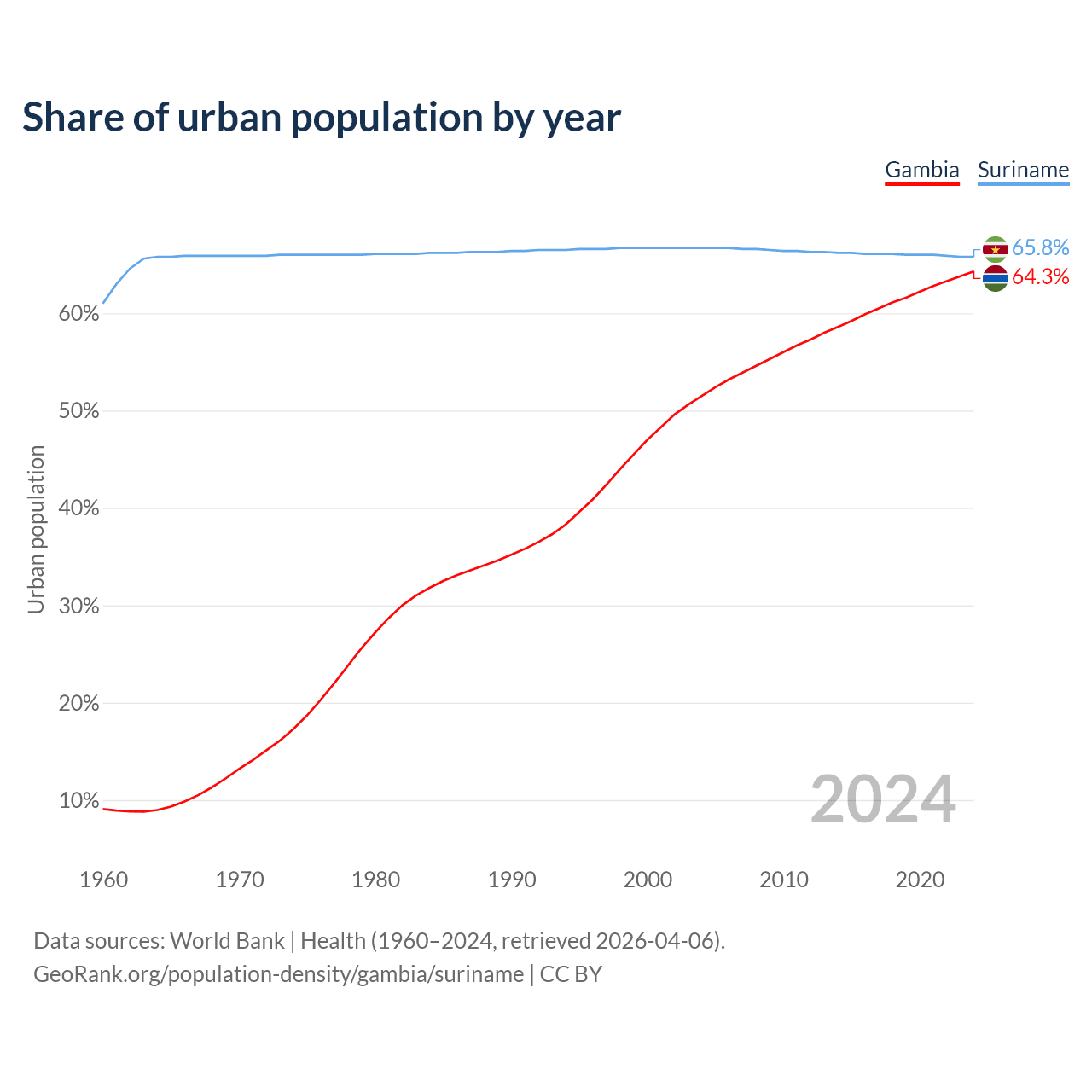 From 2004 to 2024, the share of urban population changed from 51.5% to 64.3% in the Gambia and from 66.7% to 65.8% in Suriname.