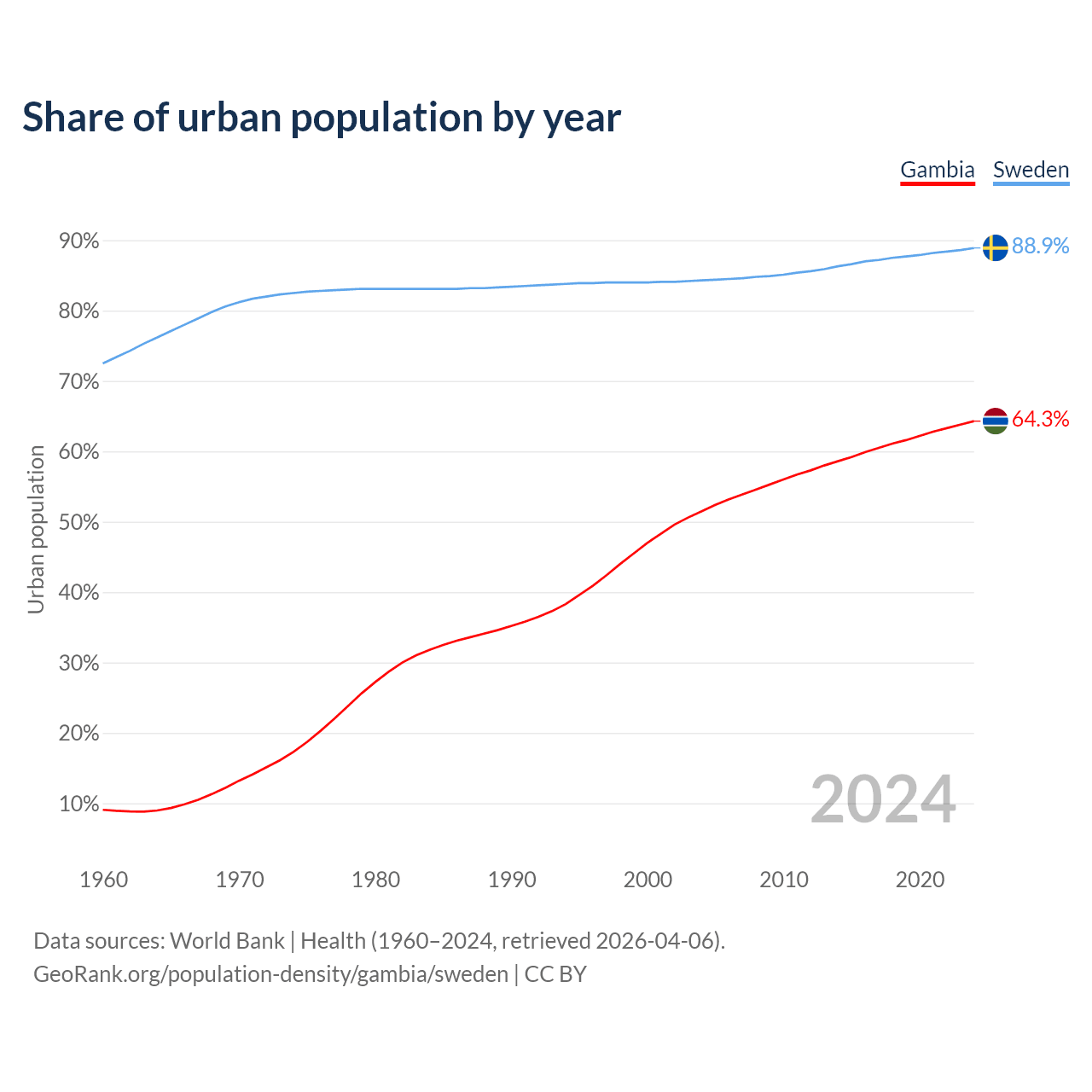 From 2004 to 2024, the share of urban population changed from 51.5% to 64.3% in the Gambia and from 84.3% to 88.9% in Sweden.