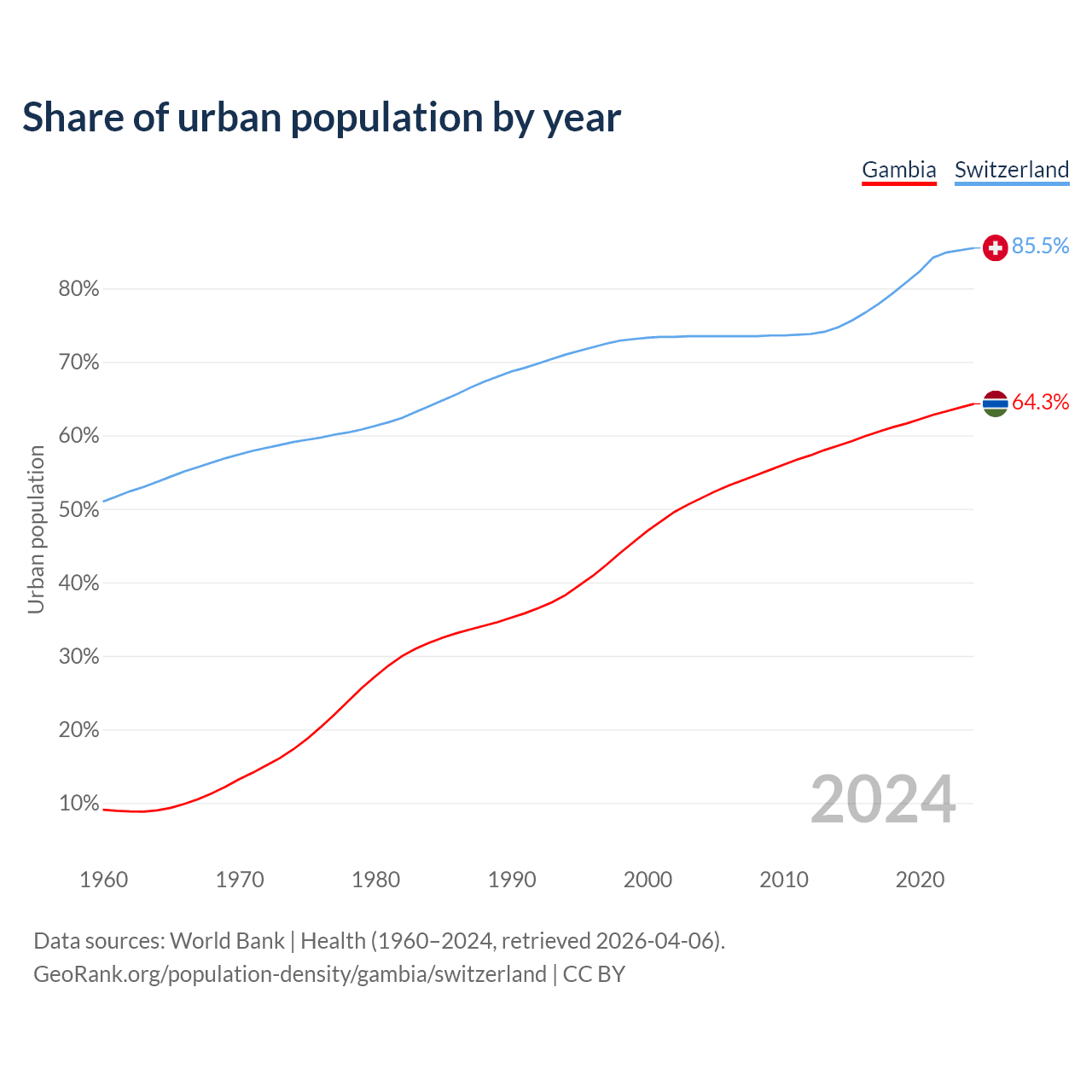 From 2004 to 2024, the share of urban population changed from 51.5% to 64.3% in the Gambia and from 73.5% to 85.5% in Switzerland.