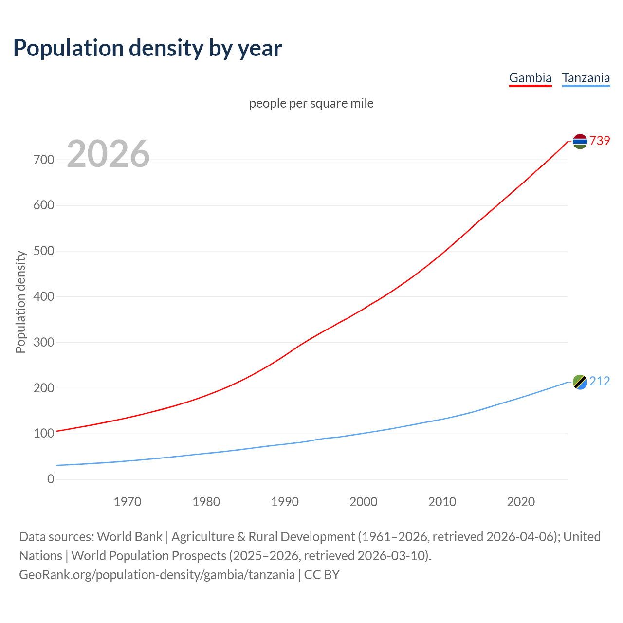 From 2006 to 2026, population density in the Gambia increased by 68.2%, compared to a 80.1% growth in Tanzania.