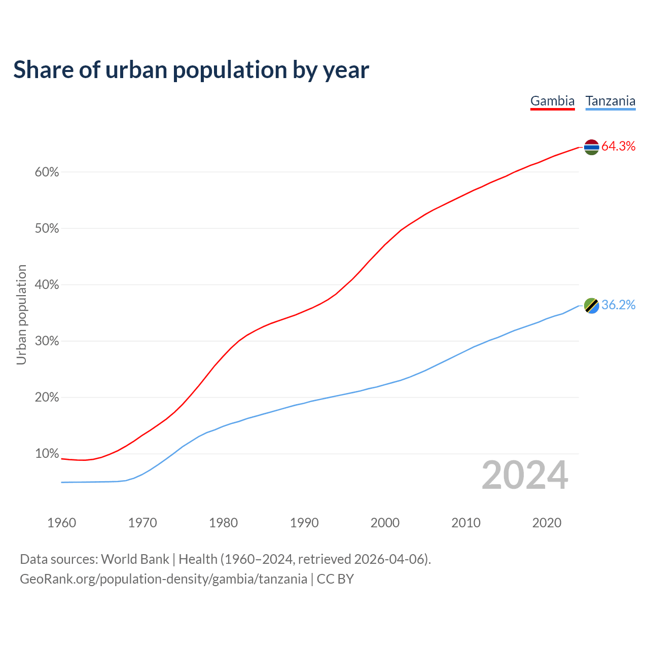 From 2004 to 2024, the share of urban population changed from 51.5% to 64.3% in the Gambia and from 24.1% to 36.2% in Tanzania.