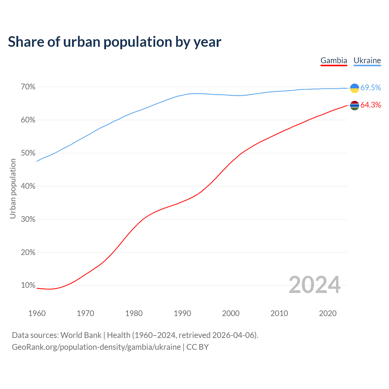 From 2004 to 2024, the share of urban population changed from 51.5% to 64.3% in the Gambia and from 67.6% to 69.5% in Ukraine.