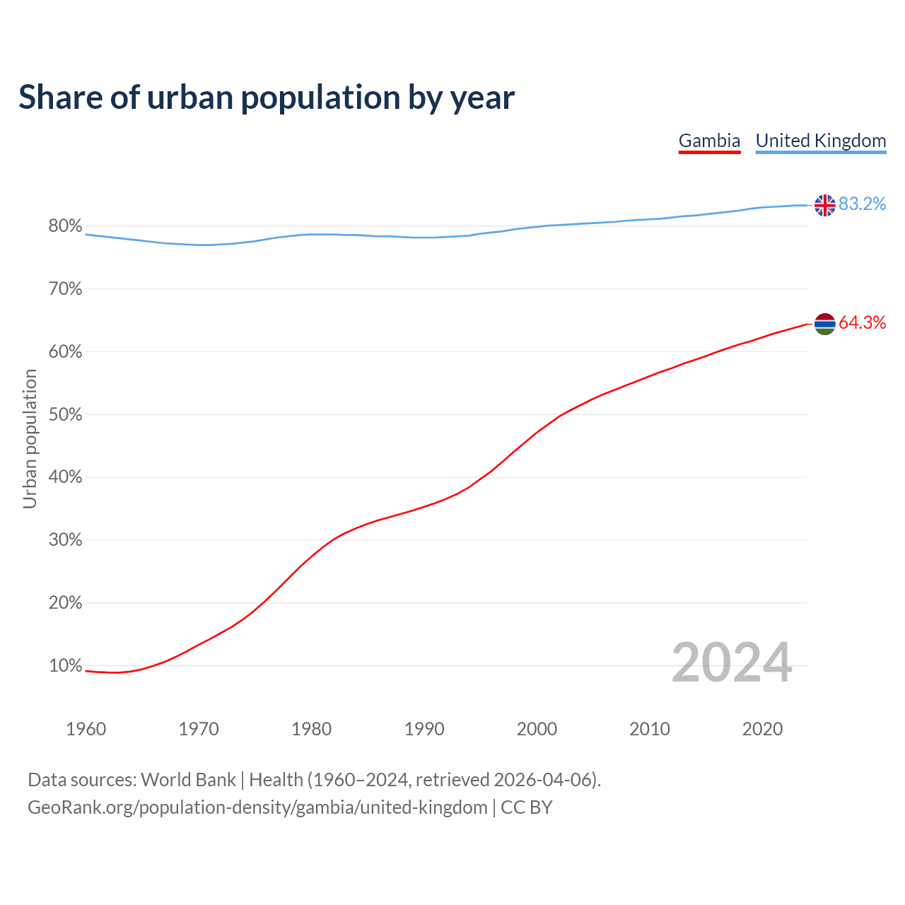 From 2004 to 2024, the share of urban population changed from 51.5% to 64.3% in the Gambia and from 80.3% to 83.2% in the United Kingdom.