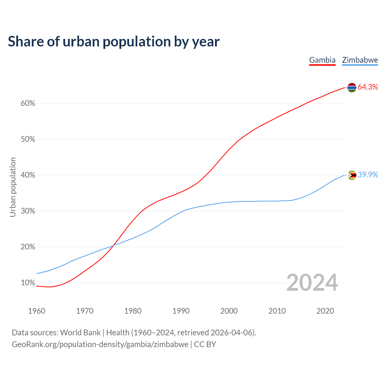 From 2004 to 2024, the share of urban population changed from 51.5% to 64.3% in the Gambia and from 32.6% to 39.9% in Zimbabwe.