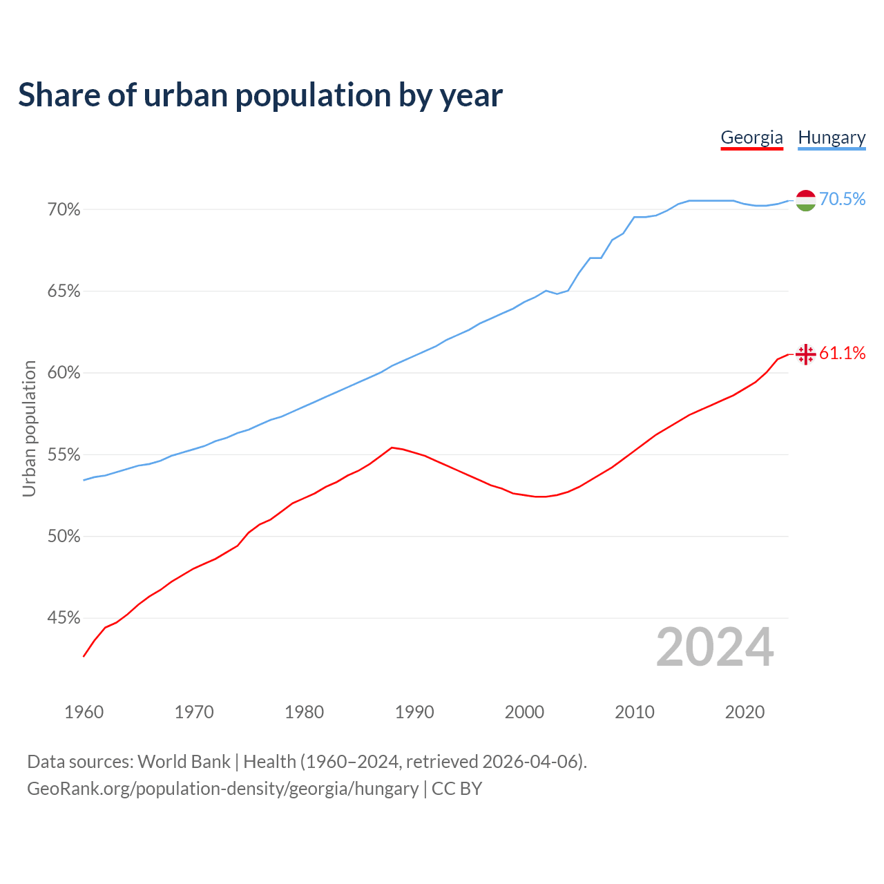From 2004 to 2024, the share of urban population changed from 52.7% to 61.1% in Georgia and from 65% to 70.5% in Hungary.
