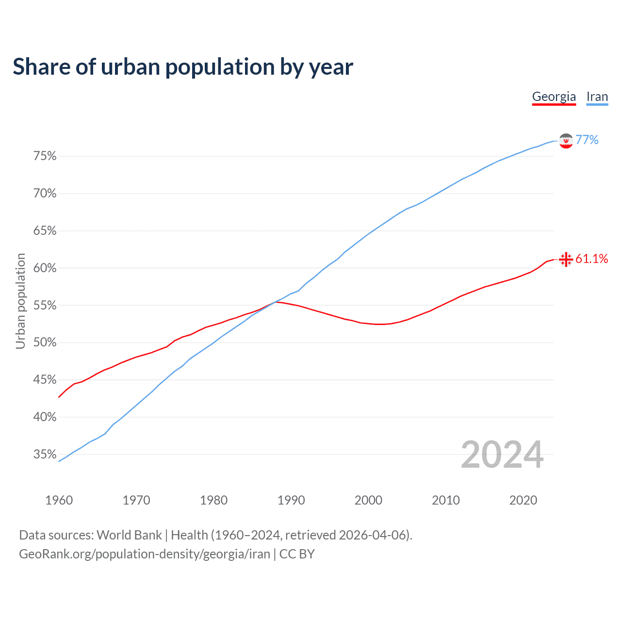 From 2004 to 2024, the share of urban population changed from 52.7% to 61.1% in Georgia and from 67.3% to 77% in Iran.