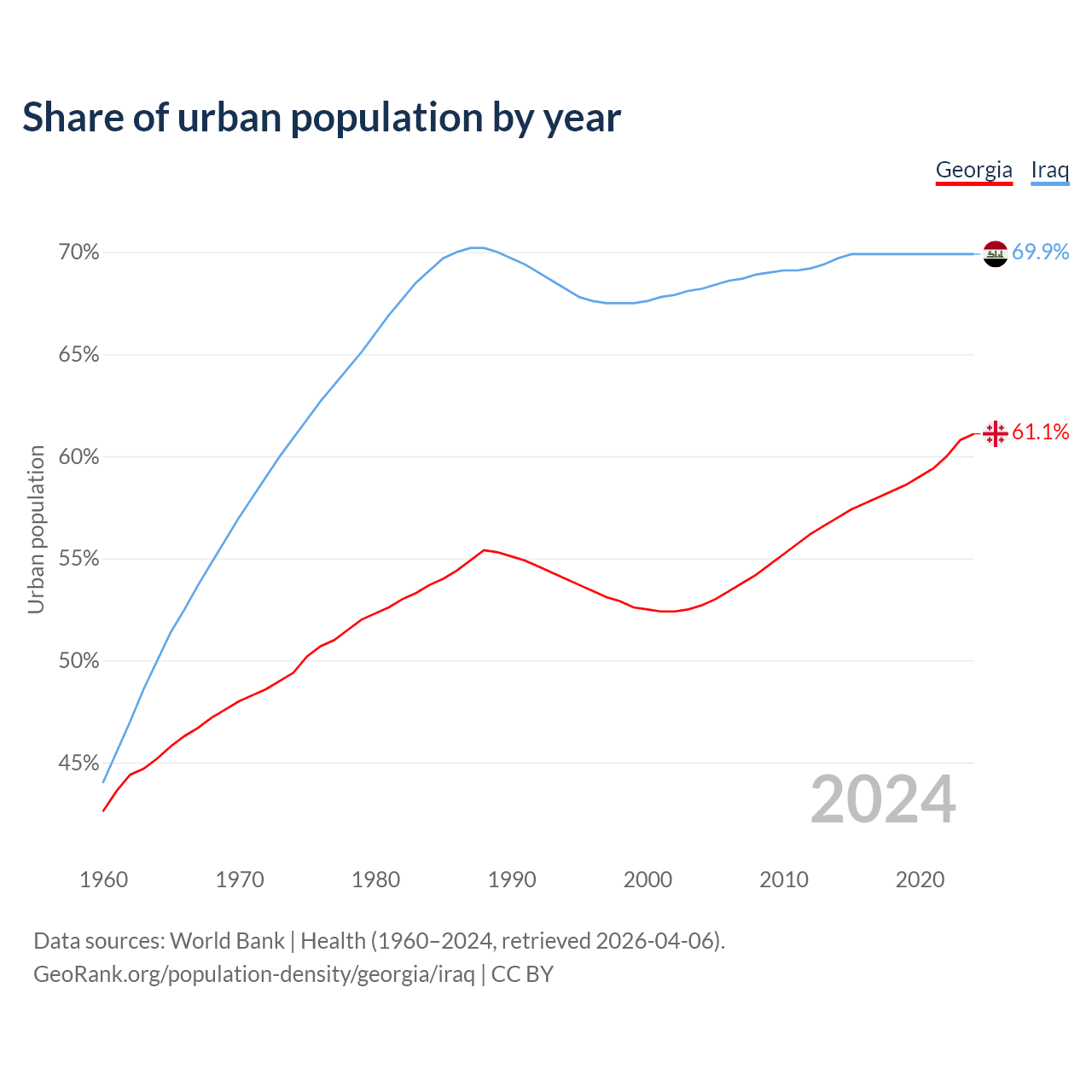 From 2004 to 2024, the share of urban population changed from 52.7% to 61.1% in Georgia and from 68.2% to 69.9% in Iraq.