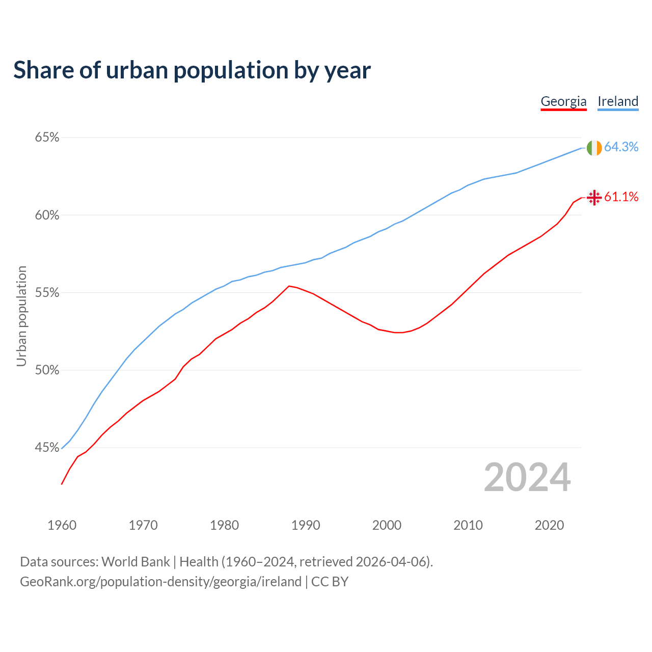 From 2004 to 2024, the share of urban population changed from 52.7% to 61.1% in Georgia and from 60.2% to 64.3% in Ireland.