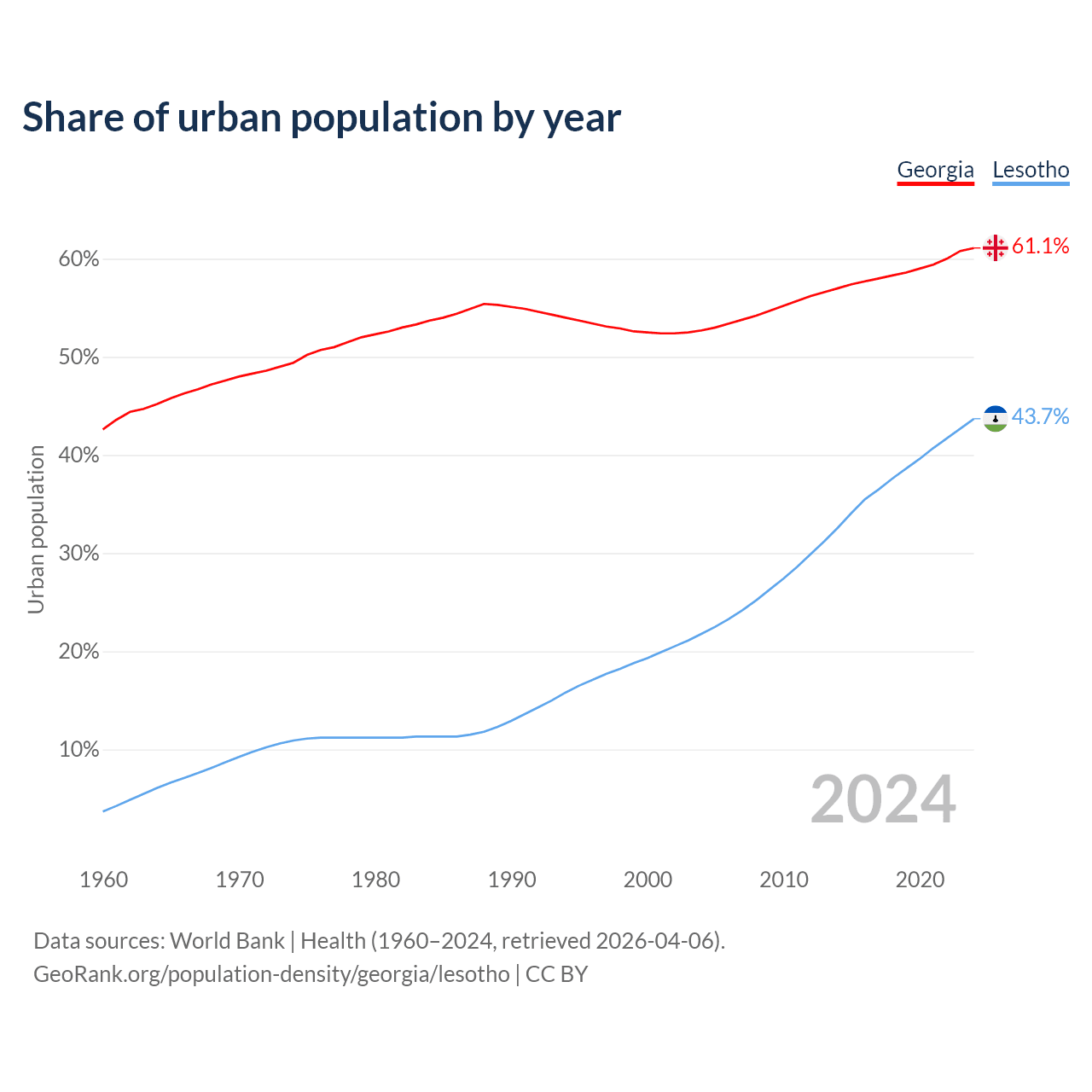From 2004 to 2024, the share of urban population changed from 52.7% to 61.1% in Georgia and from 21.8% to 43.7% in Lesotho.
