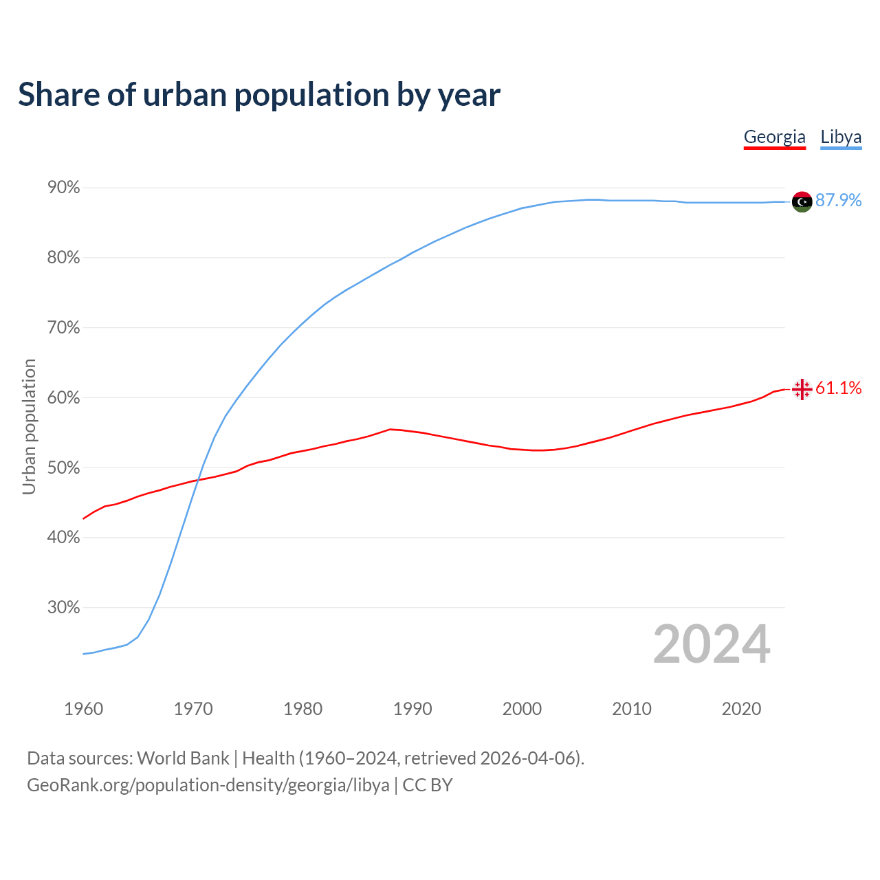 From 2004 to 2024, the share of urban population changed from 52.7% to 61.1% in Georgia and from 88% to 87.9% in Libya.