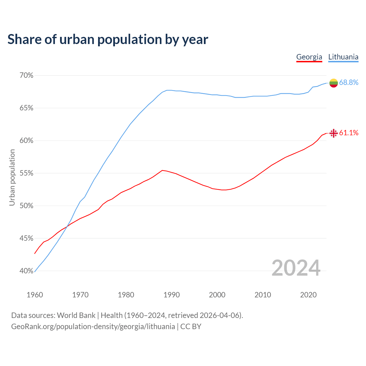 From 2004 to 2024, the share of urban population changed from 52.7% to 61.1% in Georgia and from 66.6% to 68.8% in Lithuania.