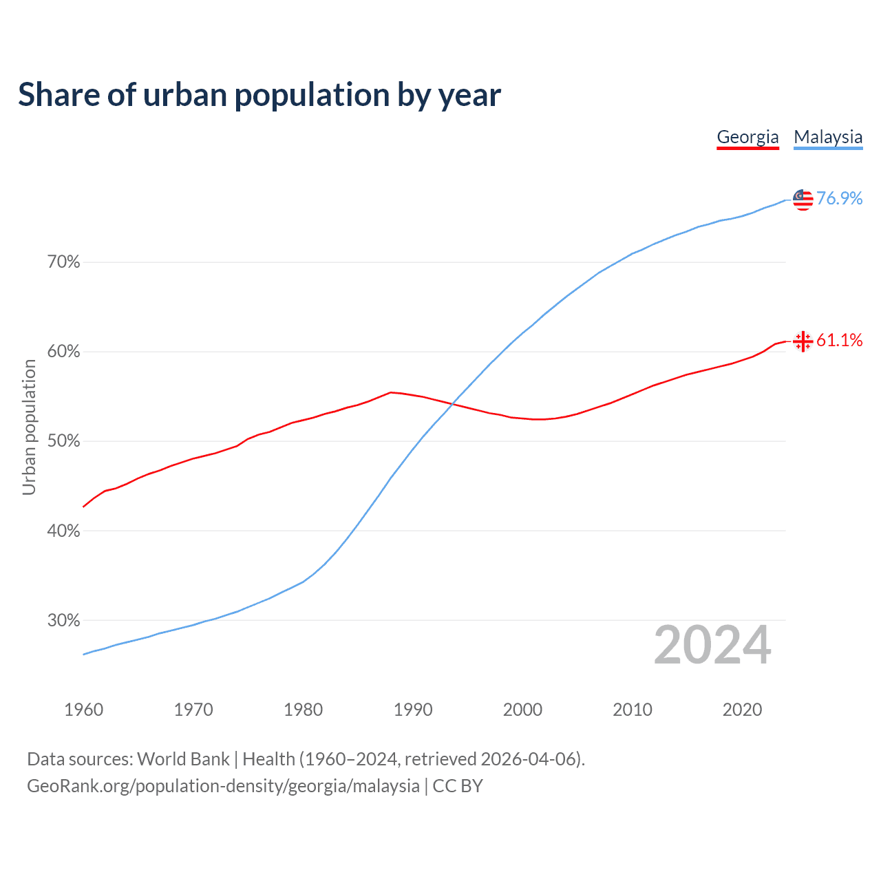 From 2004 to 2024, the share of urban population changed from 52.7% to 61.1% in Georgia and from 66.1% to 76.9% in Malaysia.