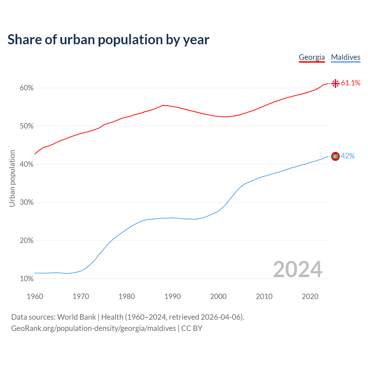 From 2004 to 2024, the share of urban population changed from 52.7% to 61.1% in Georgia and from 32.9% to 42% in Maldives.