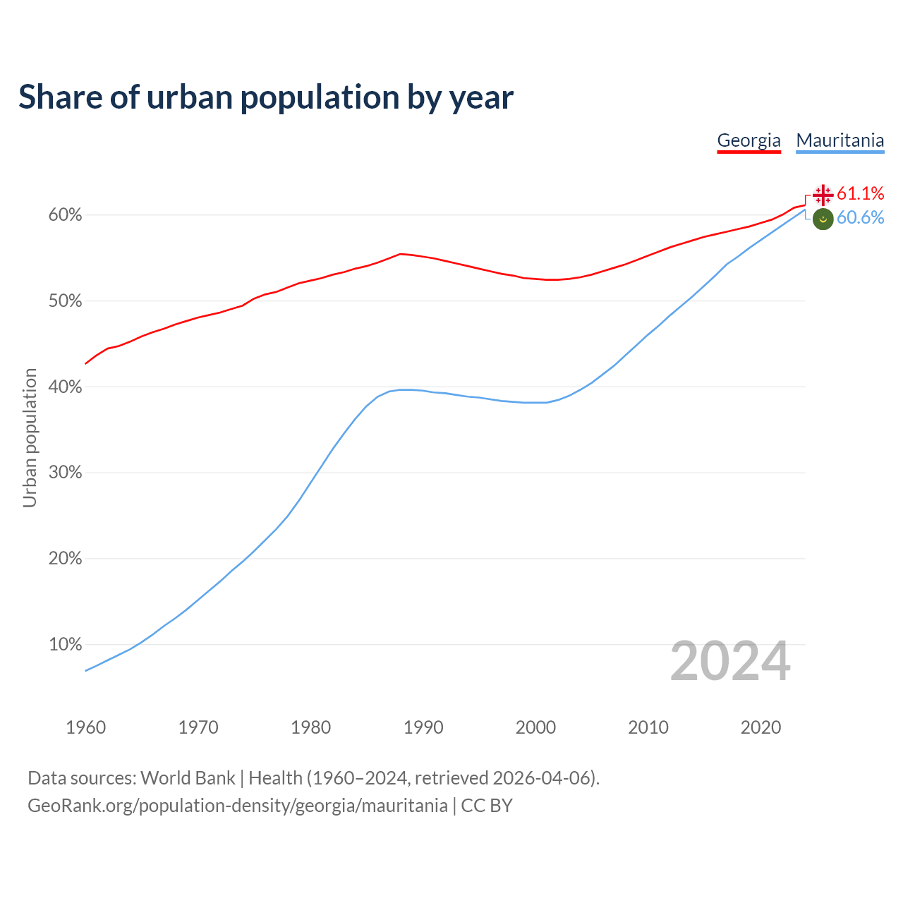 From 2004 to 2024, the share of urban population changed from 52.7% to 61.1% in Georgia and from 39.6% to 60.6% in Mauritania.