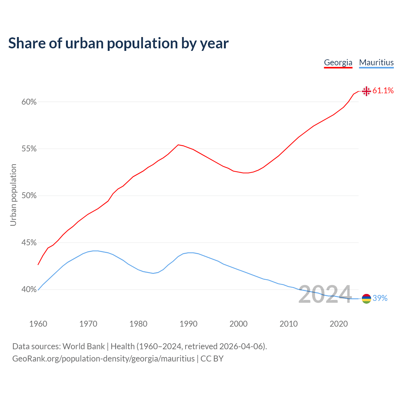 From 2004 to 2024, the share of urban population changed from 52.7% to 61.1% in Georgia and from 41.3% to 39% in Mauritius.