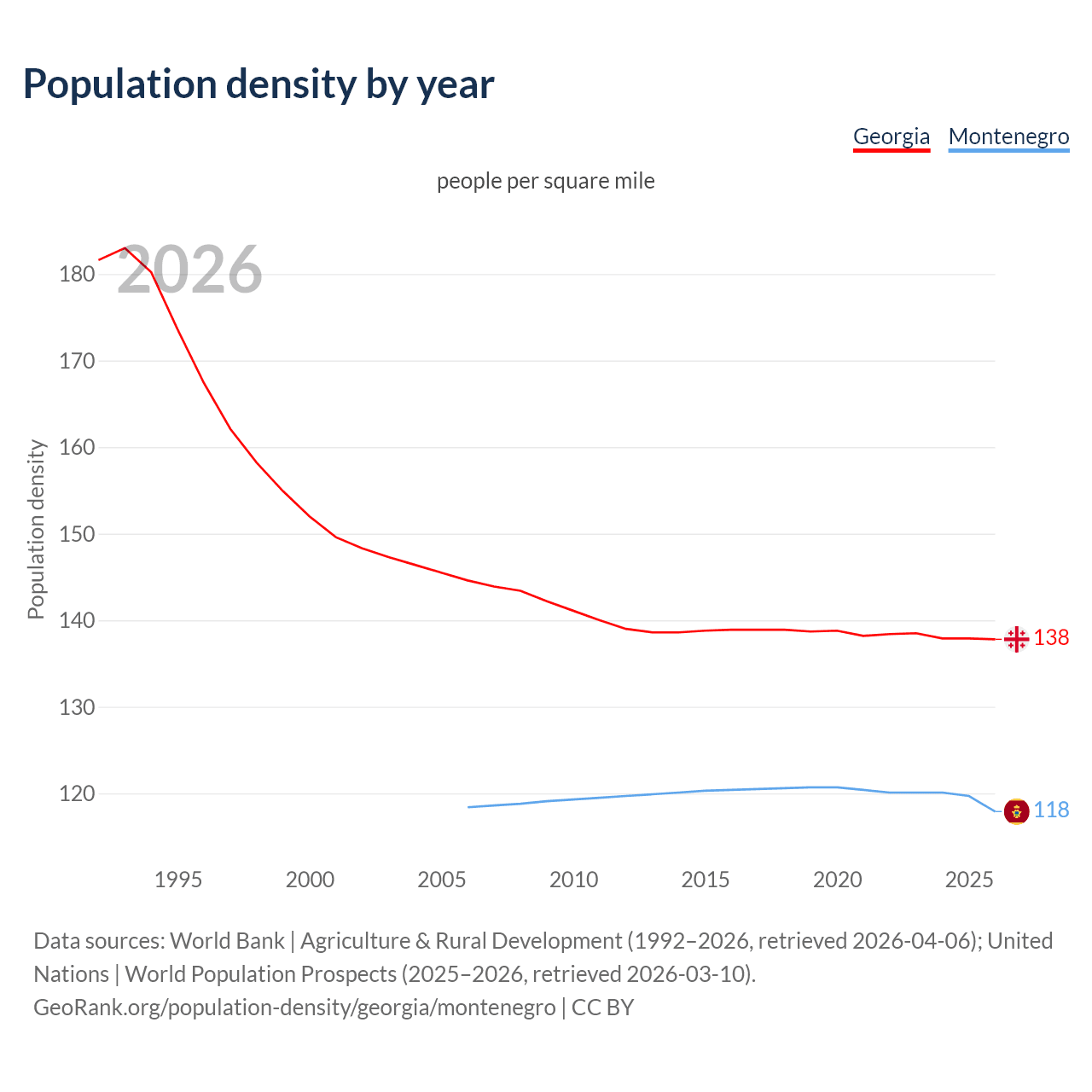 From 2006 to 2026, population density in Georgia decreased by 4.71%, compared to a 0.44% decline in Montenegro.