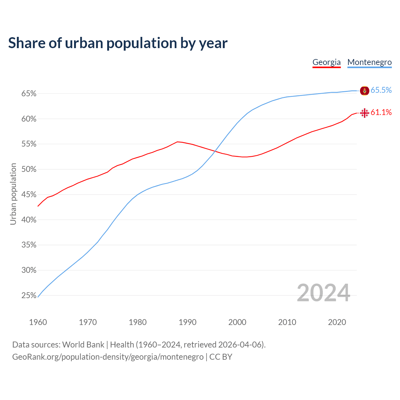 From 2004 to 2024, the share of urban population changed from 52.7% to 61.1% in Georgia and from 62.2% to 65.5% in Montenegro.