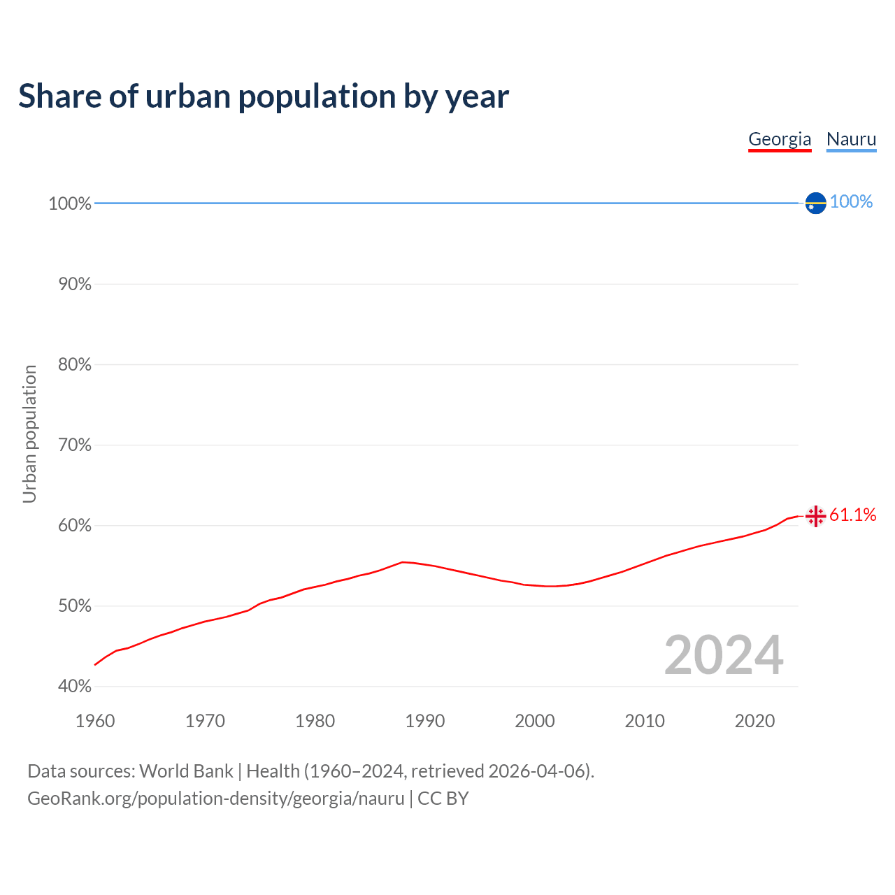 From 2004 to 2024, the share of urban population changed from 52.7% to 61.1% in Georgia and from 100% to 100% in Nauru.