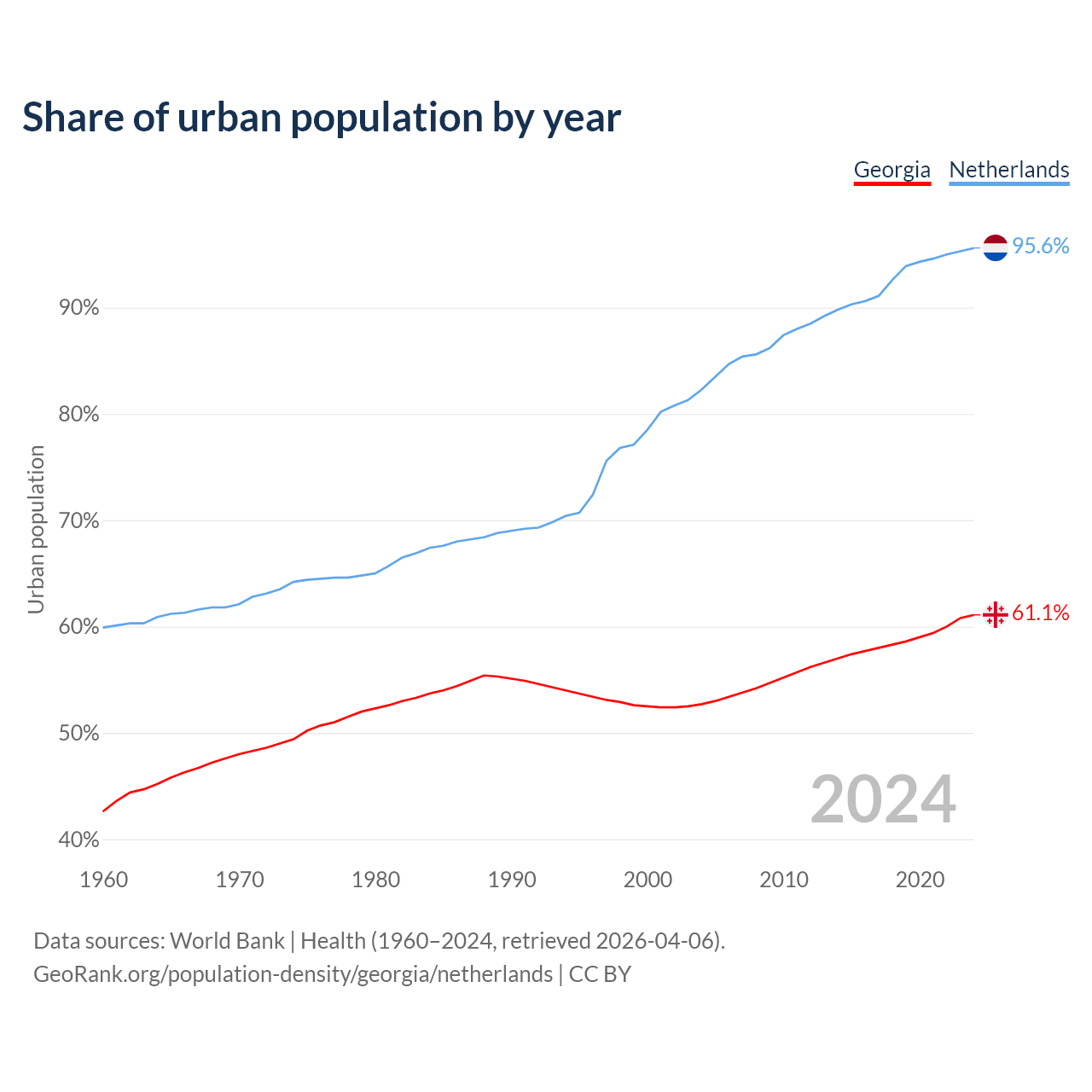 From 2004 to 2024, the share of urban population changed from 52.7% to 61.1% in Georgia and from 82.3% to 95.6% in the Netherlands.