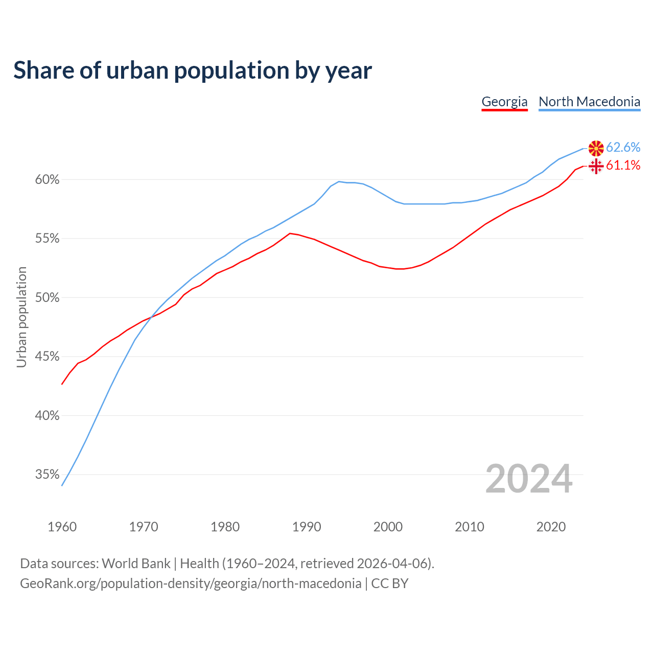 From 2004 to 2024, the share of urban population changed from 52.7% to 61.1% in Georgia and from 57.9% to 62.6% in North Macedonia.