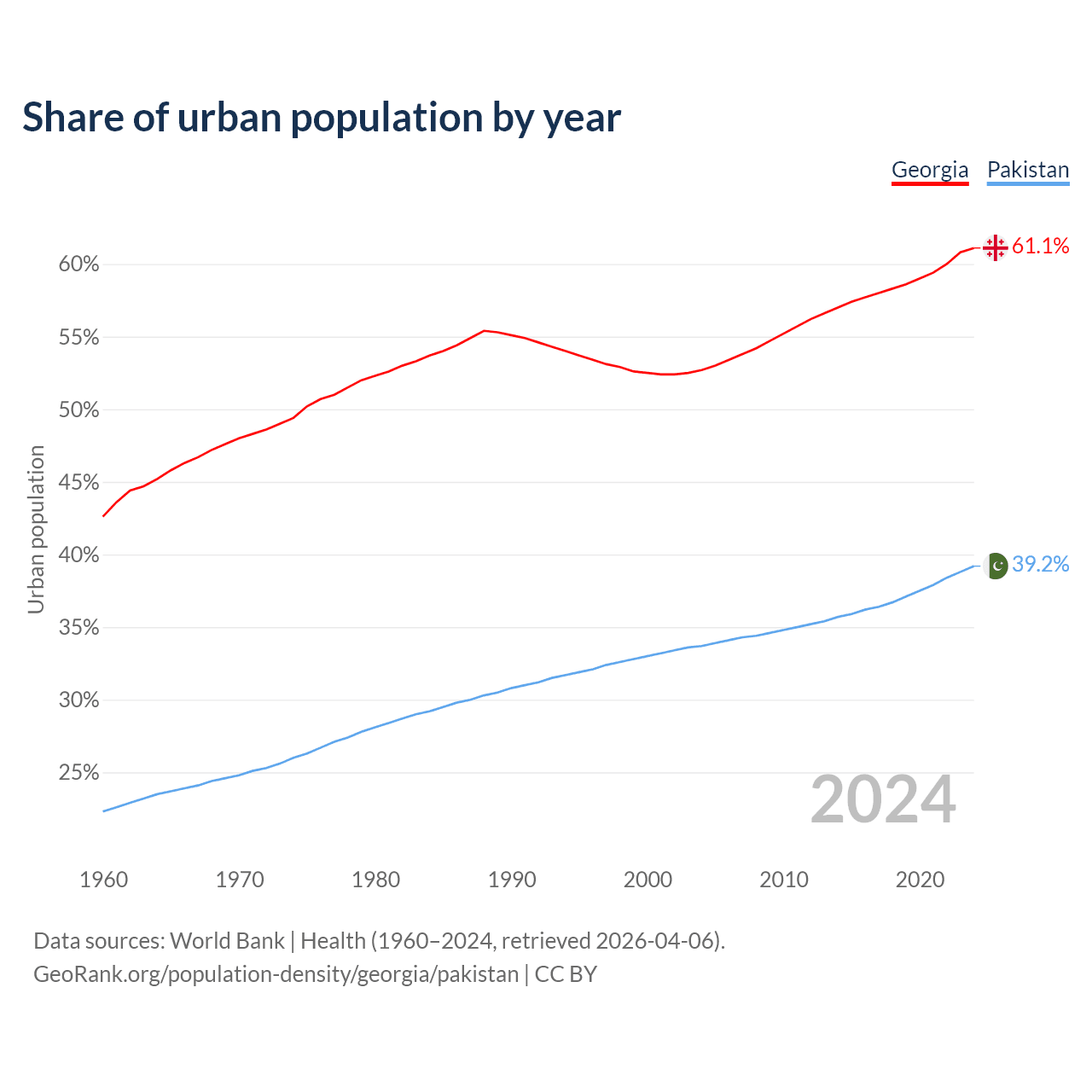 From 2004 to 2024, the share of urban population changed from 52.7% to 61.1% in Georgia and from 33.7% to 39.2% in Pakistan.