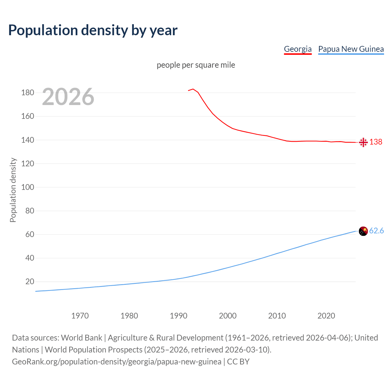 From 2006 to 2026, population density in Georgia decreased by 4.71%, compared to a 62.3% growth in Papua New Guinea.