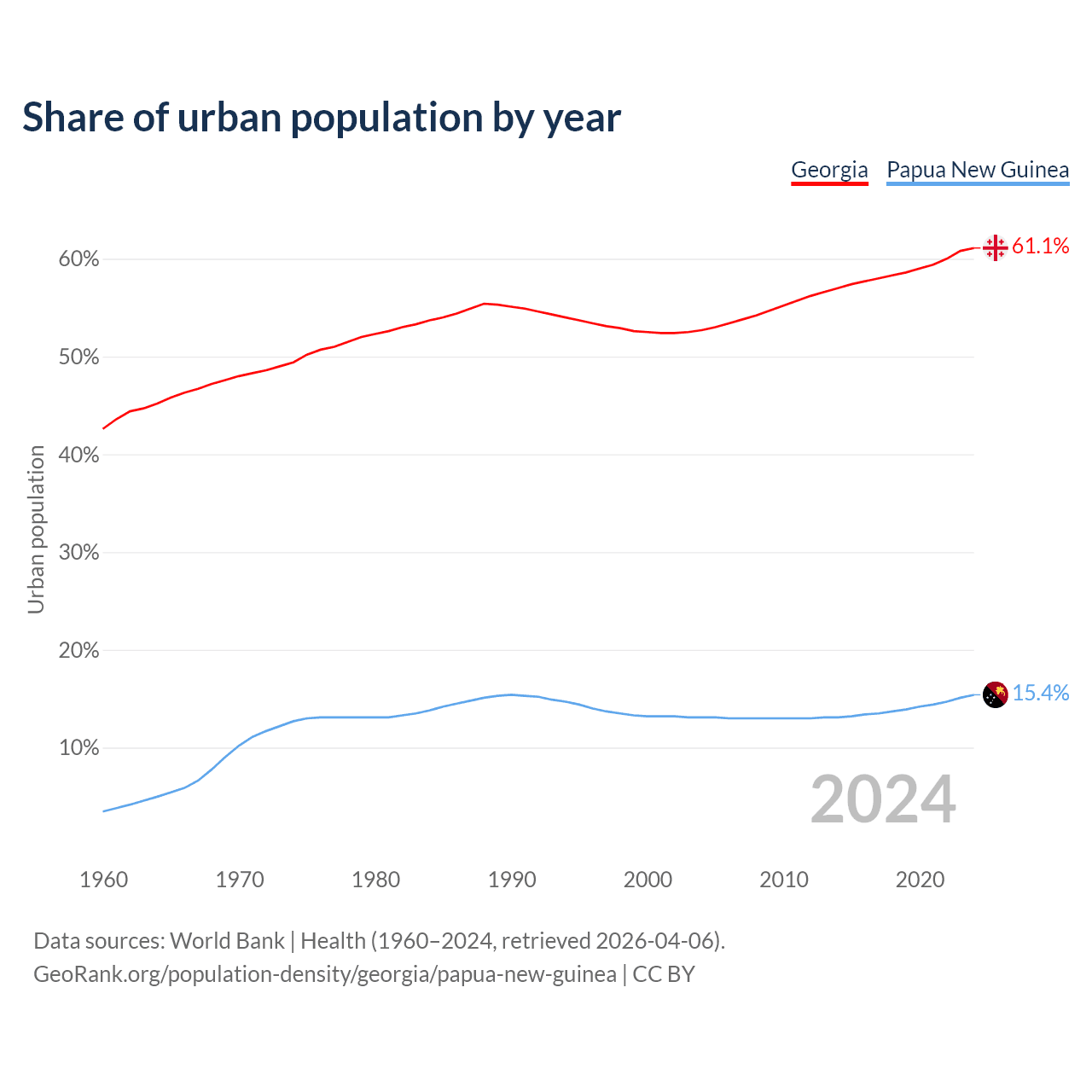 From 2004 to 2024, the share of urban population changed from 52.7% to 61.1% in Georgia and from 13.1% to 15.4% in Papua New Guinea.