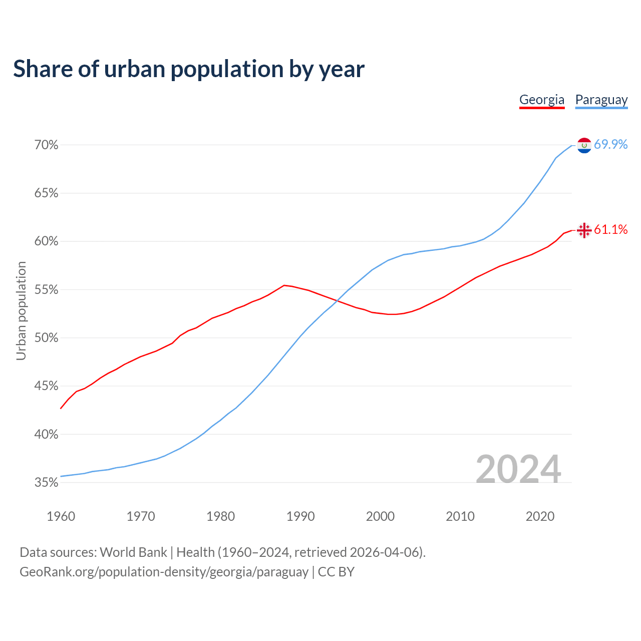 From 2006 to 2026, population density in Georgia decreased by 4.71%, compared to a 29.4% growth in Paraguay.