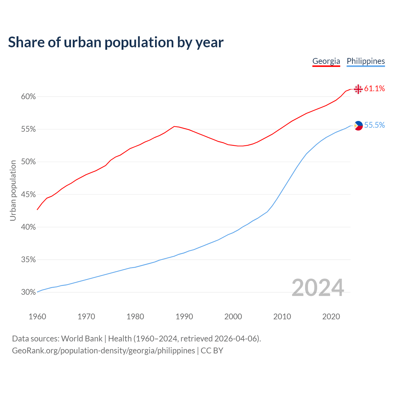 From 2004 to 2024, the share of urban population changed from 52.7% to 61.1% in Georgia and from 40.9% to 55.5% in the Philippines.