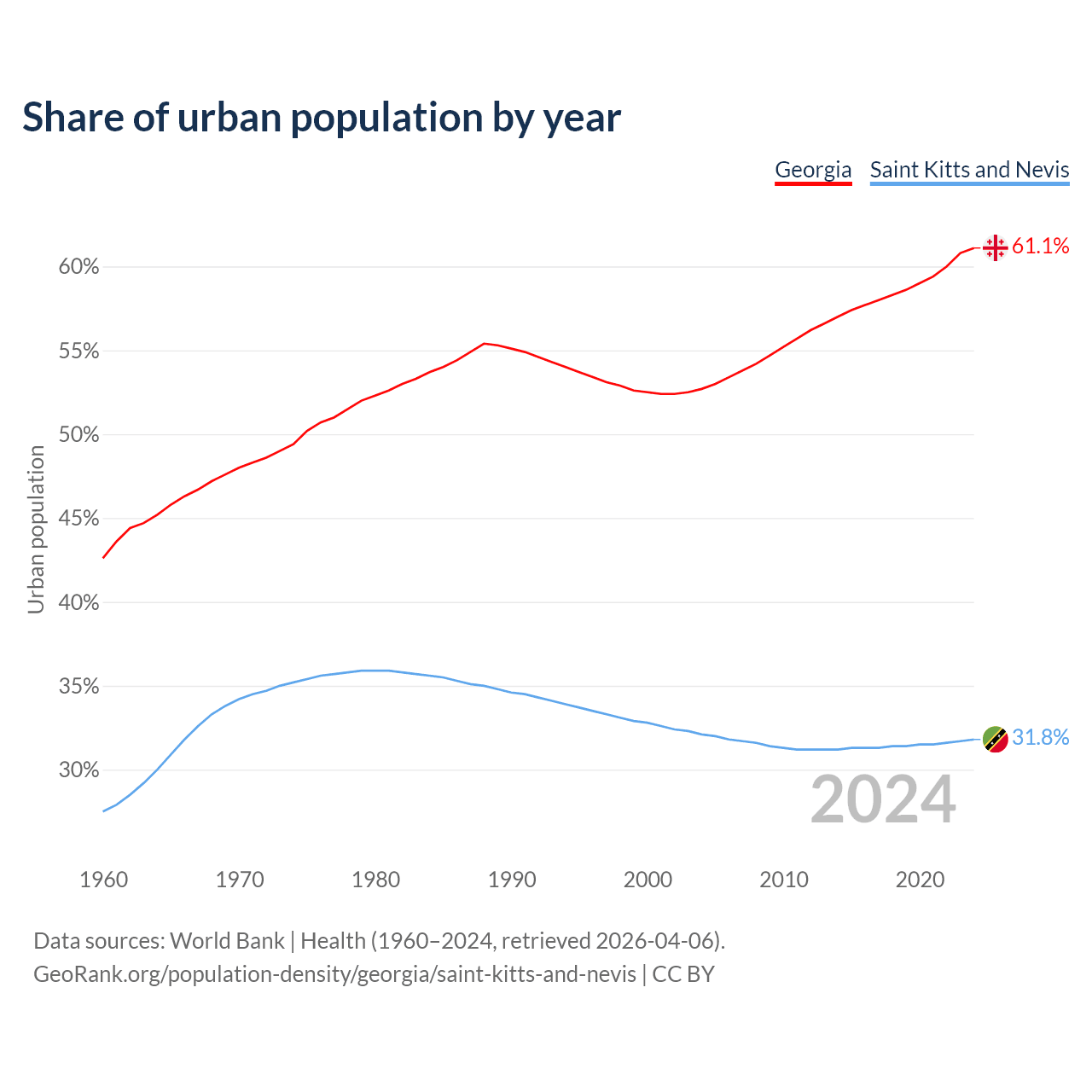 From 2006 to 2026, population density in Georgia decreased by 4.71%, compared to a 0.93% growth in Saint Kitts and Nevis.