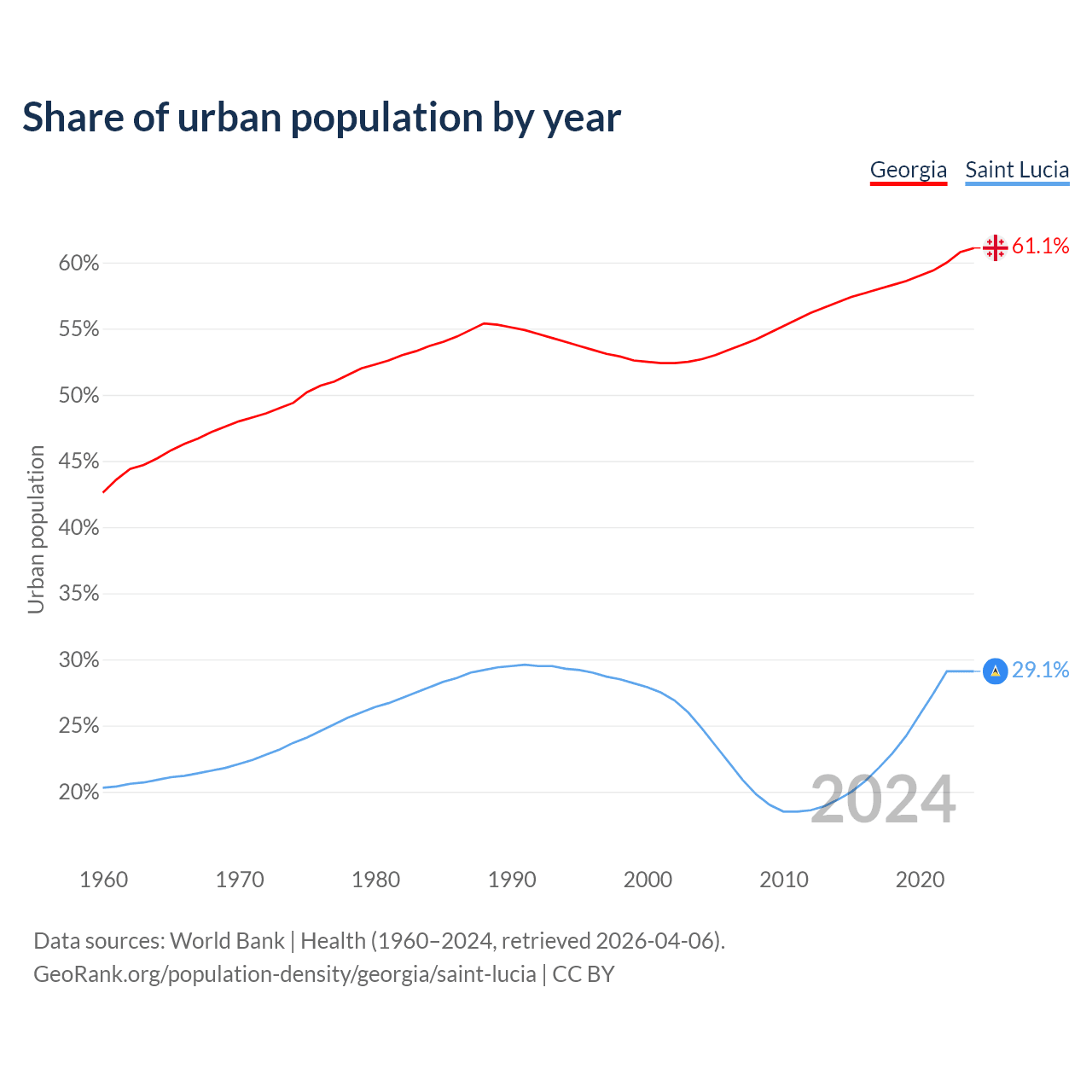 From 2004 to 2024, the share of urban population changed from 52.7% to 61.1% in Georgia and from 24.8% to 29.1% in Saint Lucia.
