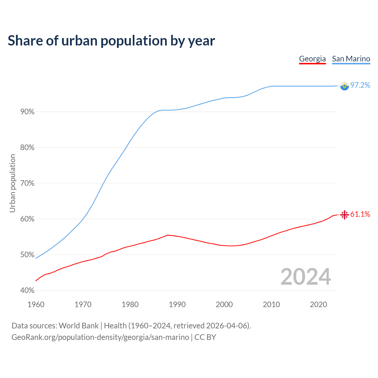 From 2004 to 2024, the share of urban population changed from 52.7% to 61.1% in Georgia and from 94.2% to 97.2% in San Marino.