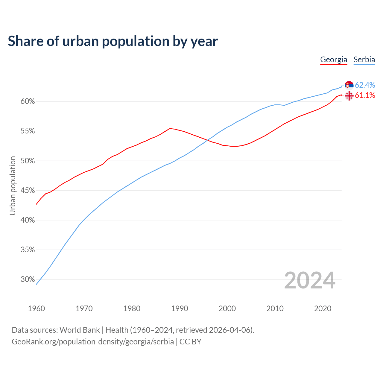 From 2004 to 2024, the share of urban population changed from 52.7% to 61.1% in Georgia and from 57.3% to 62.4% in Serbia.
