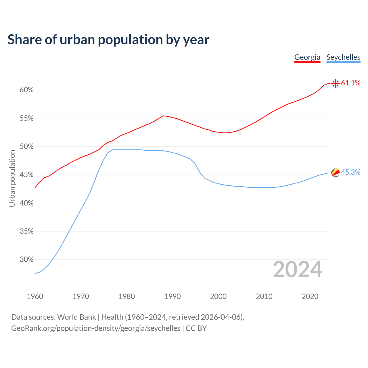From 2004 to 2024, the share of urban population changed from 52.7% to 61.1% in Georgia and from 42.9% to 45.3% in the Seychelles.