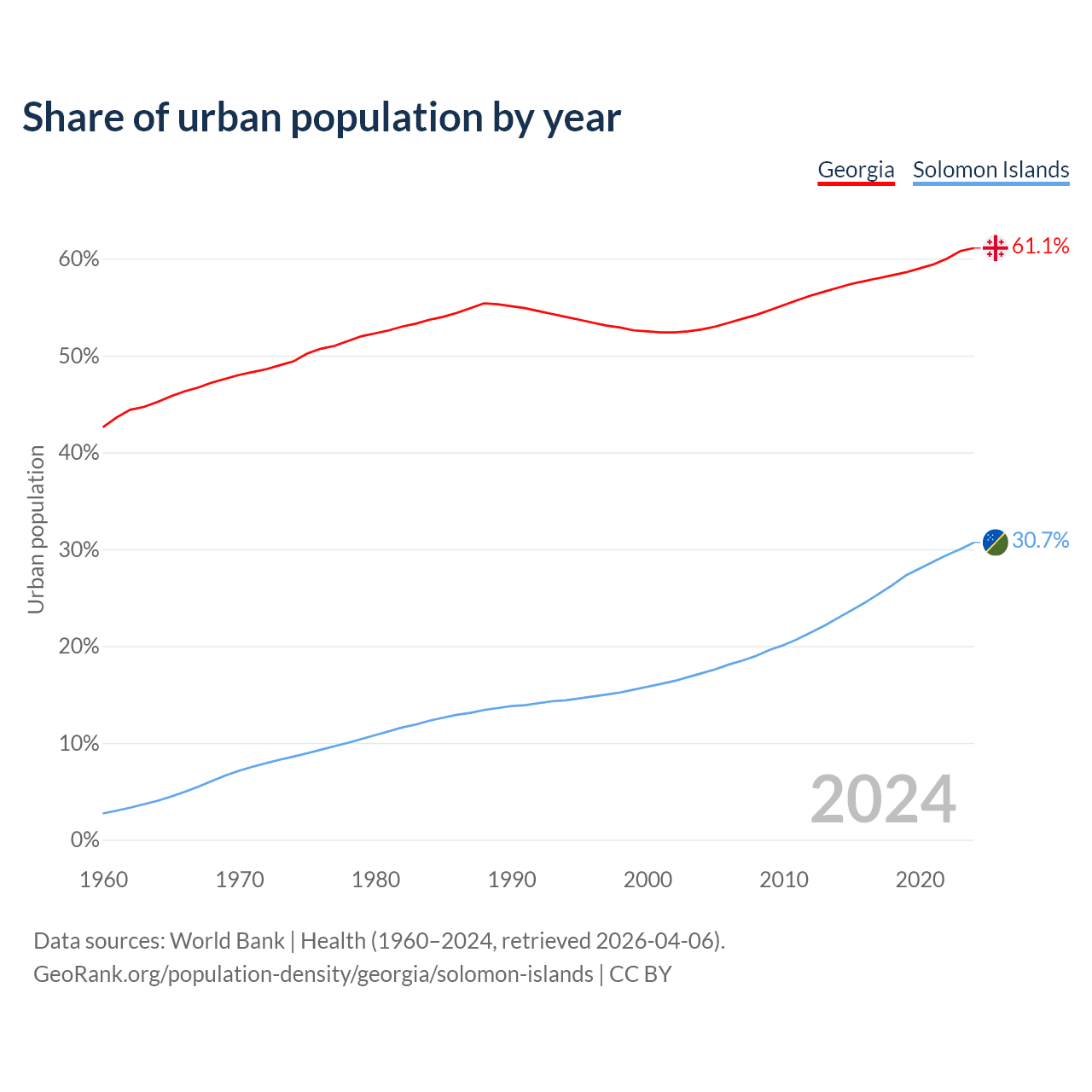 From 2004 to 2024, the share of urban population changed from 52.7% to 61.1% in Georgia and from 17.2% to 30.7% in the Solomon Islands.
