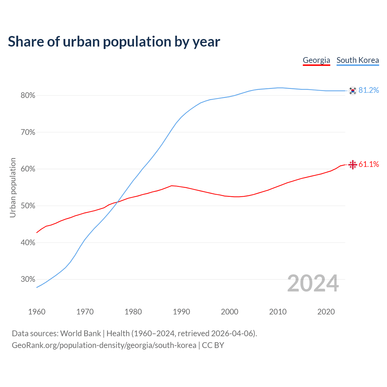 From 2006 to 2026, population density in Georgia decreased by 4.71%, compared to a 5.84% growth in South Korea.