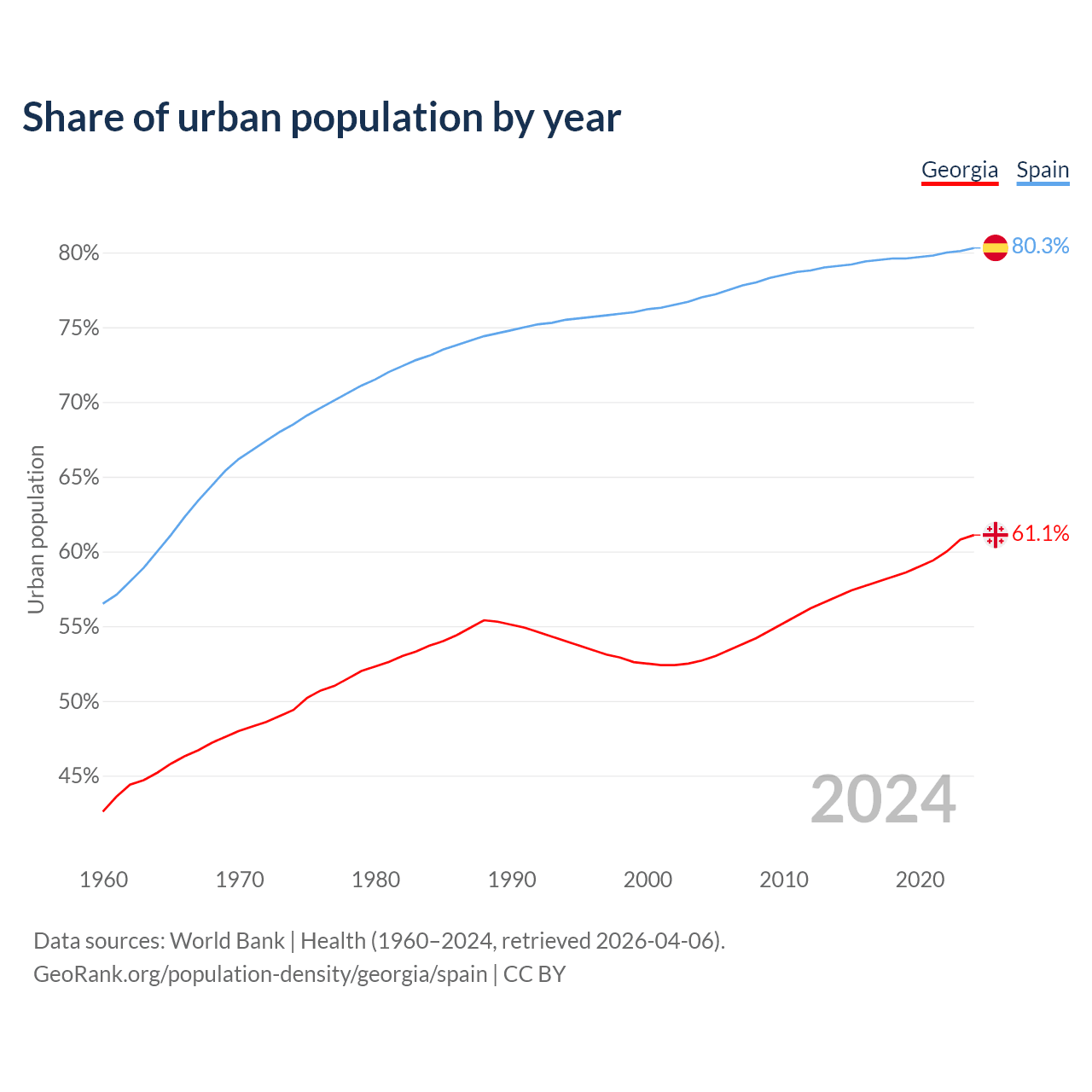 From 2004 to 2024, the share of urban population changed from 52.7% to 61.1% in Georgia and from 77% to 80.3% in Spain.